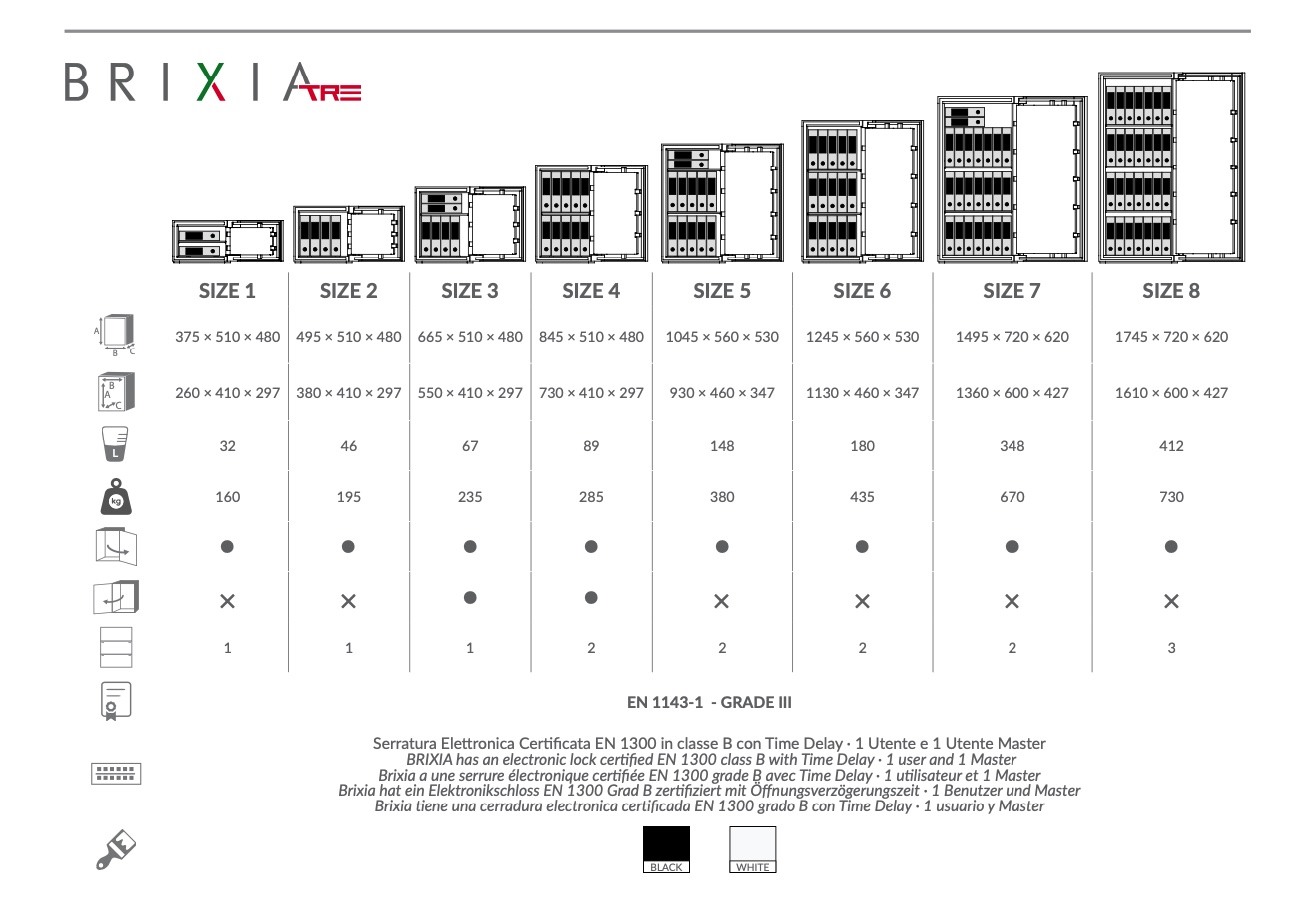Концептуально революционный сейф BRIXIA от Bordogna. Воплощение безупречного итальянского стиля в сочетании с непревзойдённой защитой от взлома. Модель Brixia TRE в третьем размере является самой популярной, в первую очередь, за счёт возможности установить её практически в любом месте, в том числе и под столом. Благодаря электронному замку с мембранной клавиатурой и автозапиранием, убирающейся ручке с поршневым приводом, дверь у сейфа абсолютно плоская. Уникальность этой и следующей за ней модели заключается в том, что они доступны не только в белом и чёрном исполнении, но и с левосторонним открыванием. Такого сочетания решений нет ни у одного другого сейфа в мире.